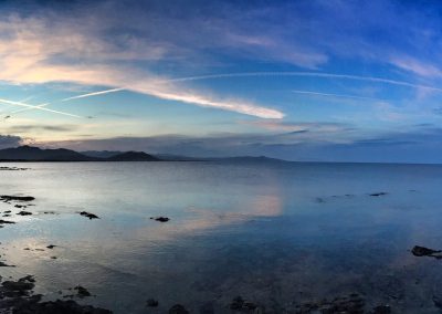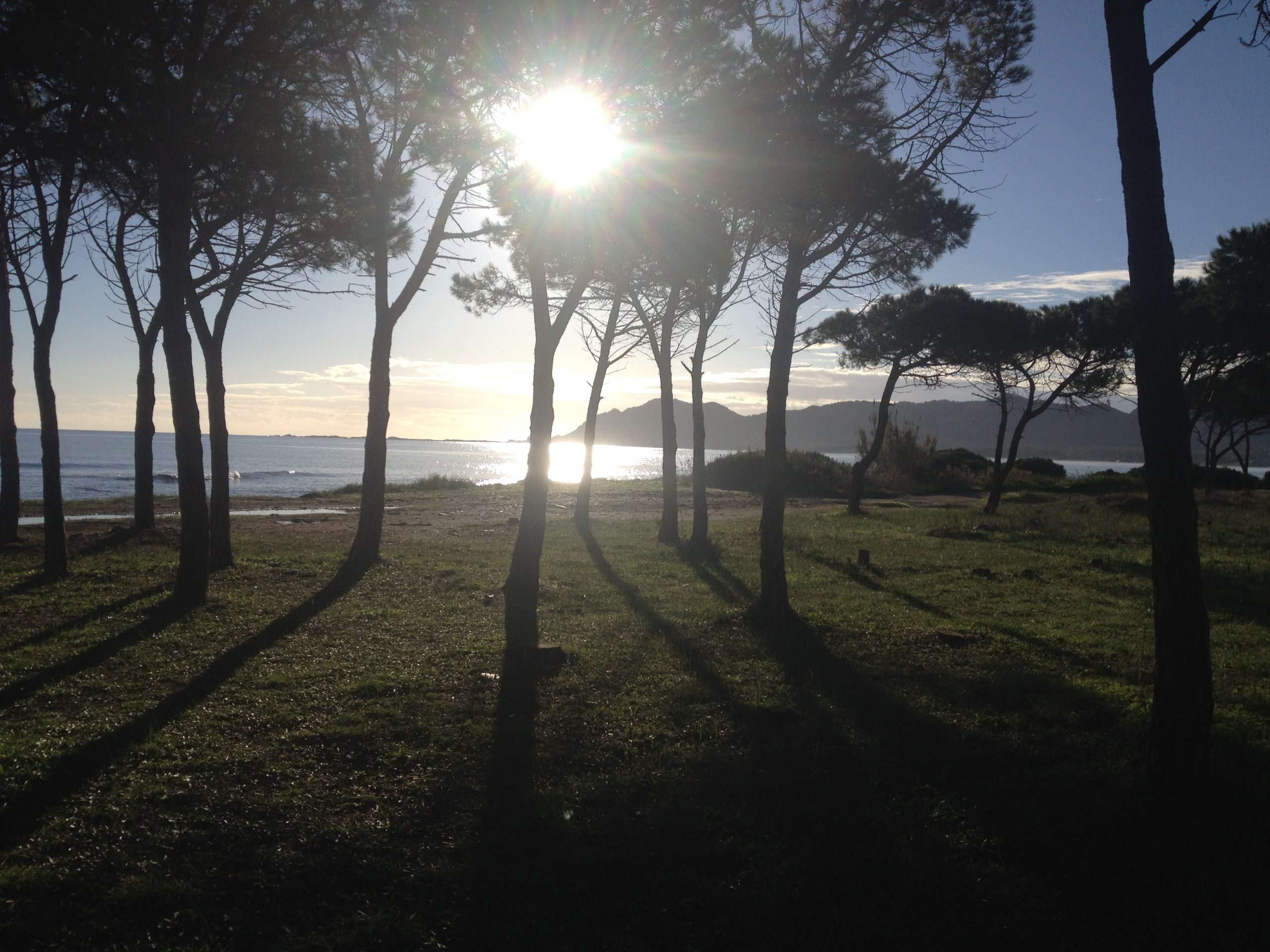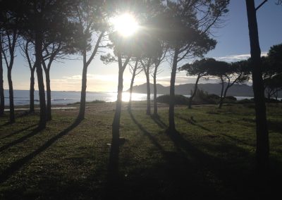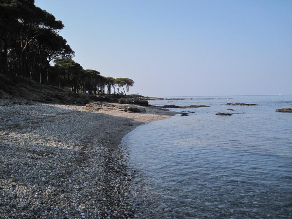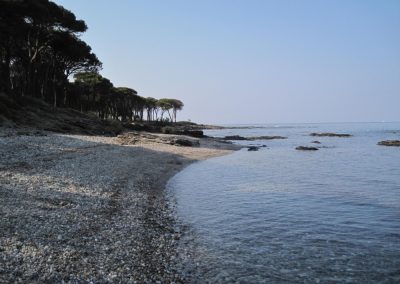 Lungo la pineta di Mandras si trova una spiaggia unica: l’arenile è composto da piccole pietre levigate e quasi sferiche, simili a confetti. Il suono delle onde che muovono i ciottoli e i riflessi della luce rendono questo luogo particolarmente suggestivo e riconoscibile.